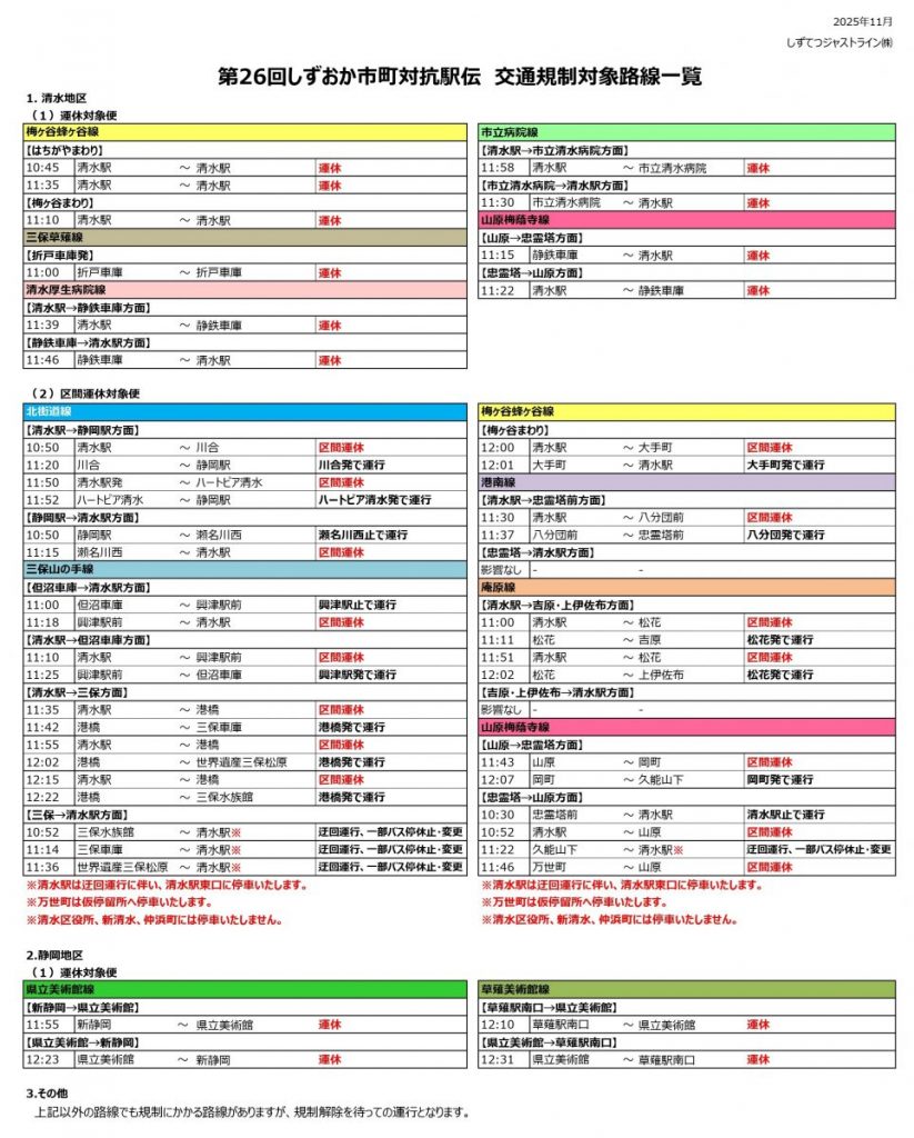 「第26回しずおか市町対抗駅伝競走大会」の開催に伴う交通規制により、静岡市内各路線に迂回・運休が発生します。ご利用の際はご注意下さい。