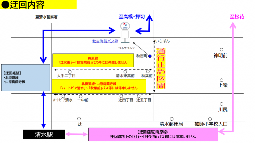 ※迂回経路上の「辻」~「神明前」バス停には止まりません。(「清水駅前」発の次のバス停は「松花」になります。)