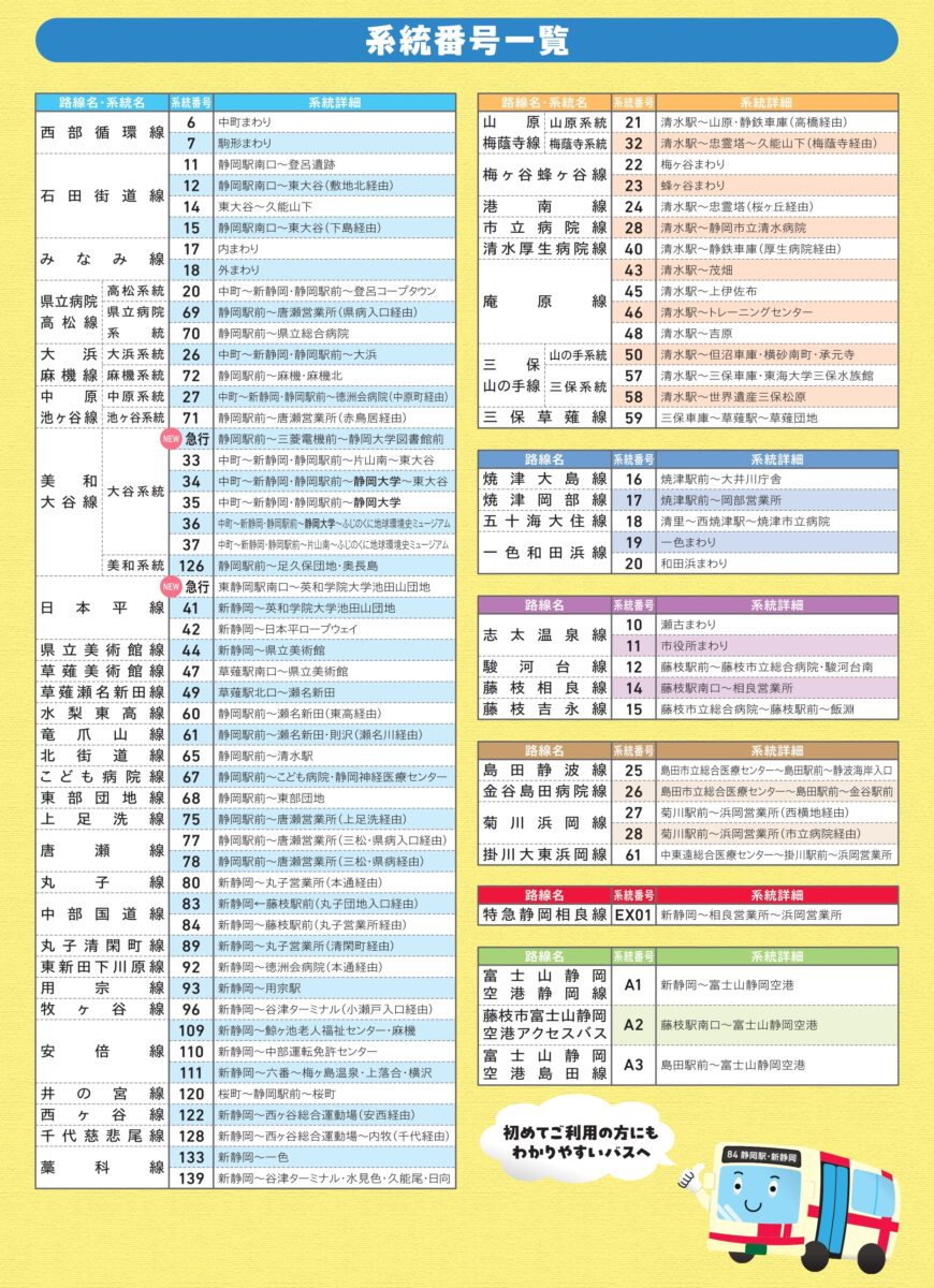 - 注)「静岡駅」および「清水駅」をまたぐ路線については、駅を境に別の系統番号となります。例)大浜麻機線 (大浜系統・駅以南:26/麻機系統・駅以北:72)