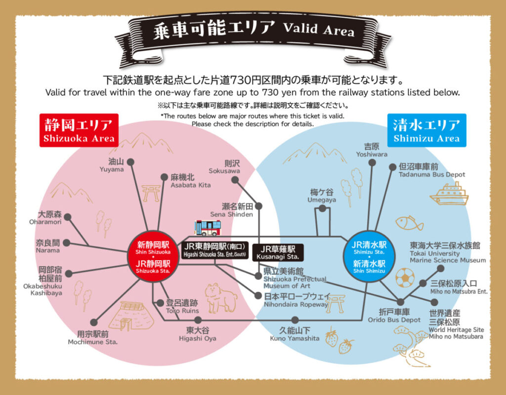 静岡駅・東静岡駅・草薙駅・清水駅を起点とした静鉄バス路線の片道730円区間エリア内停留所間の乗降が可能です。(ただし、三保草薙線は全線利用可。)